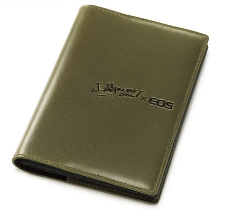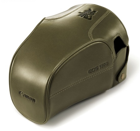 La 550D viene con algunas cosillas cambiadas, como el color de la correa y del cuerpo, el color de la rosca de selección de modo y, de regalo pagándolo, una cartera y una funda de «Special Edition», con un simbolito de Jackie. Todo esto en color oro, que a mi me parece verde oliva, pero bueno.